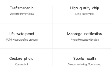 | Other Functions | Support Alarm,Calender,Sedentary reminder,Camera remote control,Anti-lost, | |||